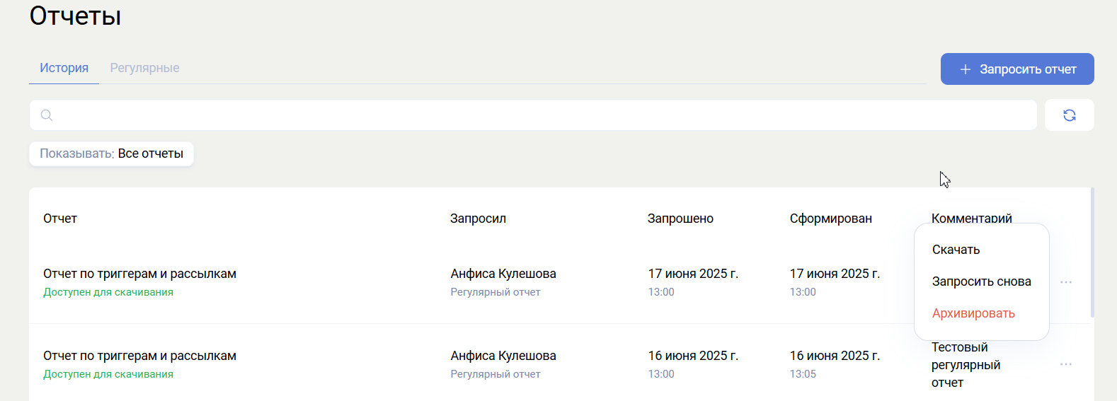 - Запрошено — время, когда отчет был запрошен.