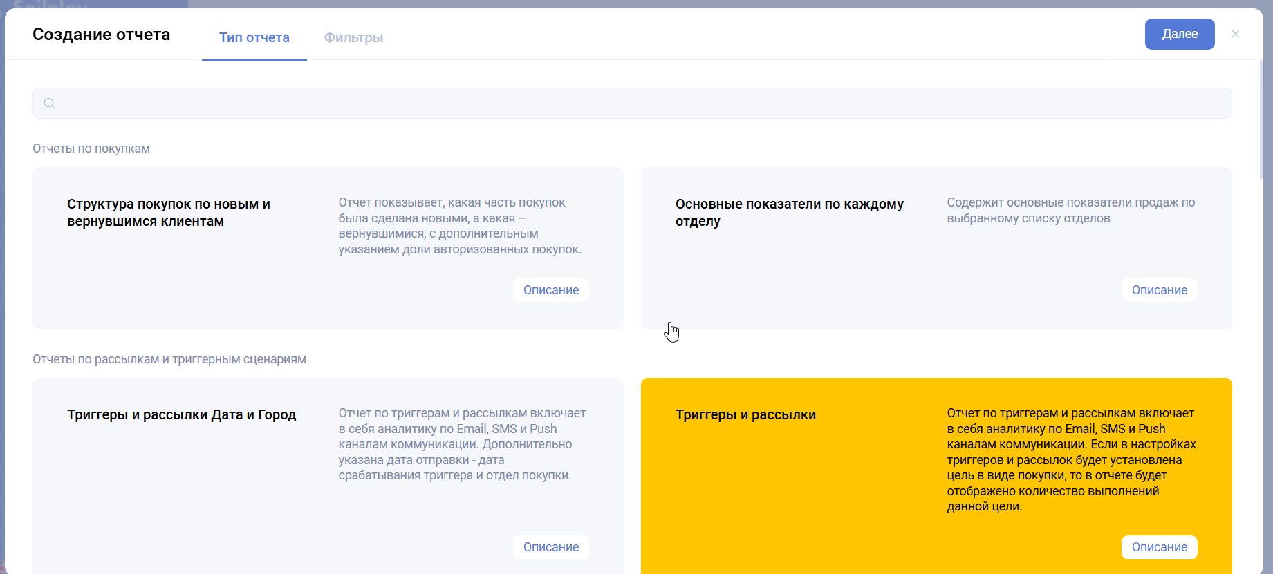 - Триггеры и рассылки — включает в себя аналитику по Email, SMS и Push каналам коммуникации. Если в настройках триггеров и рассылок будет установлена цель в виде покупки, то в отчете будет отображено количество выполнений данной цели.