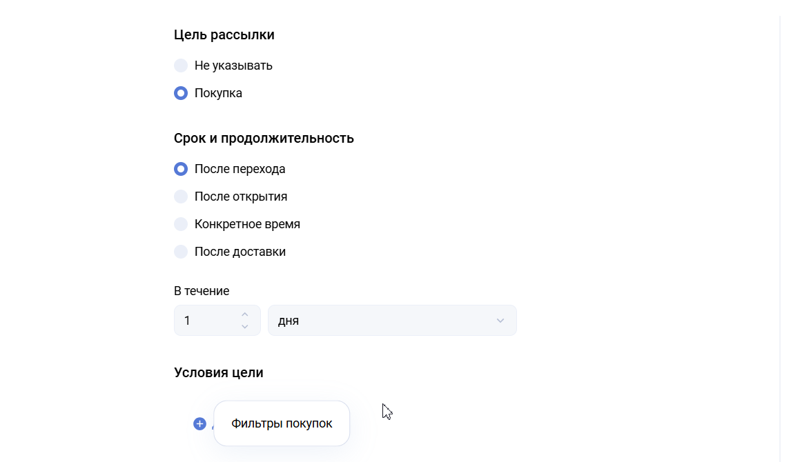 - После открытия — учитываются покупки, совершенные пользователями, которые открыли сообщения рассылки. Также устанавливается время после открытия сообщения, в течение которого должна произойти покупка. Доступно для Email рассылок и Push.