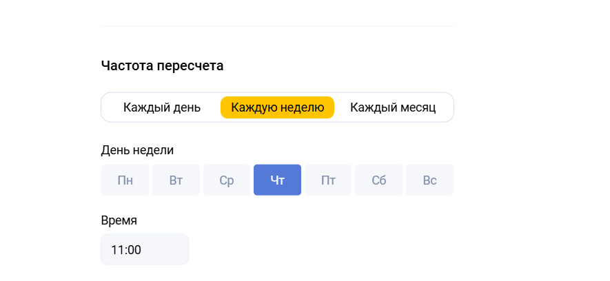 При формировании регулярного отчета на вкладке “Фильтры” появляется дополнительный блок, позволяющий настроить периодичность выгрузки.