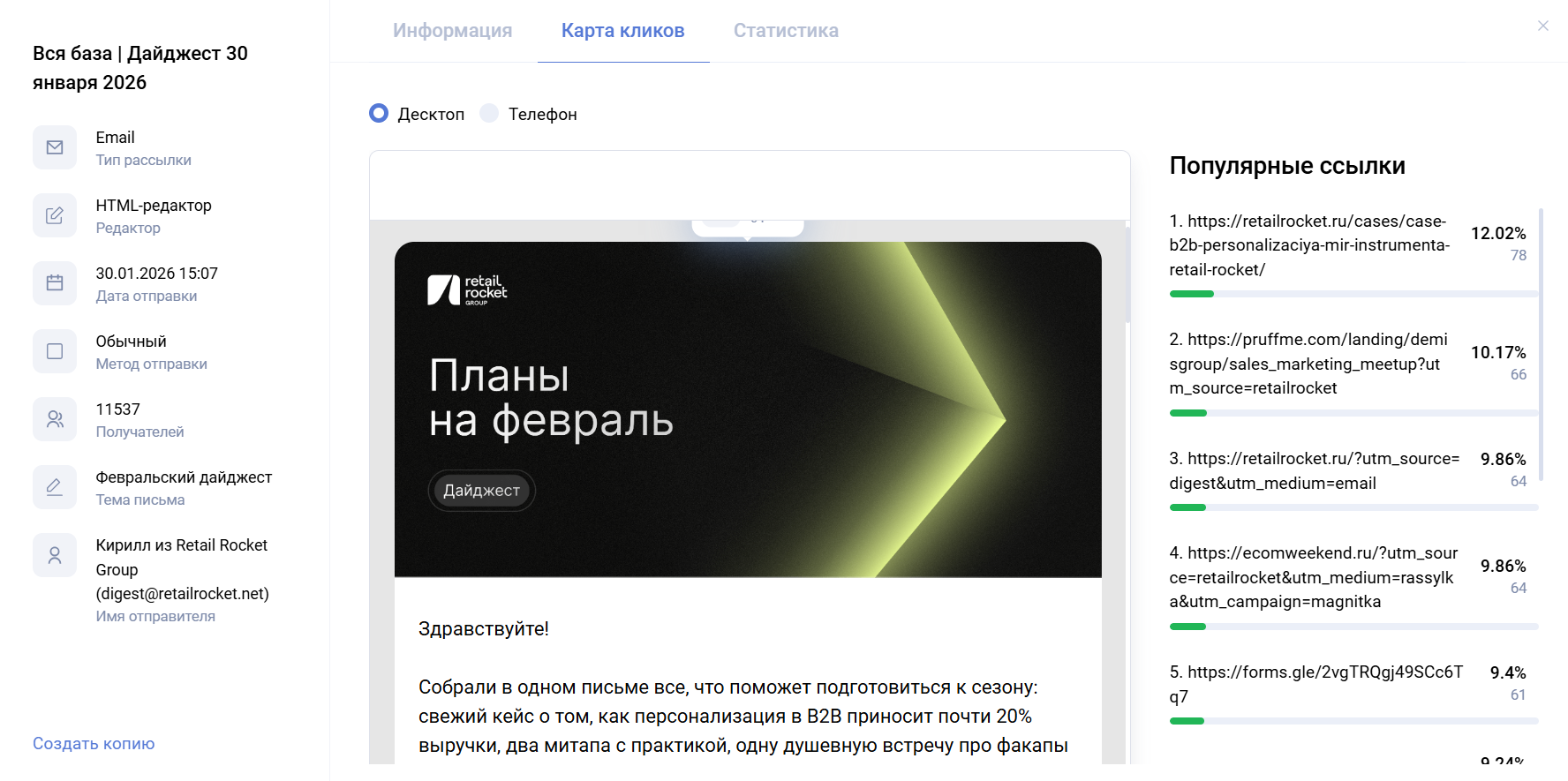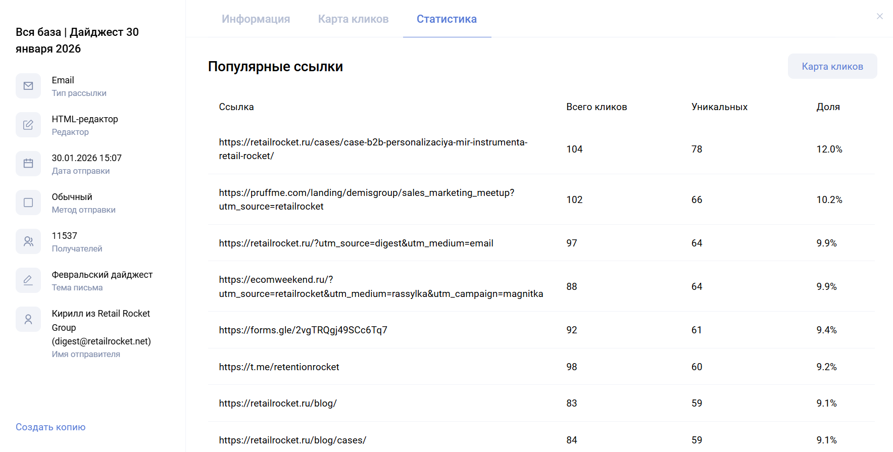 На карте кликов можно посмотреть статистику по переходам на каждую ссылку, что есть в рассылке.