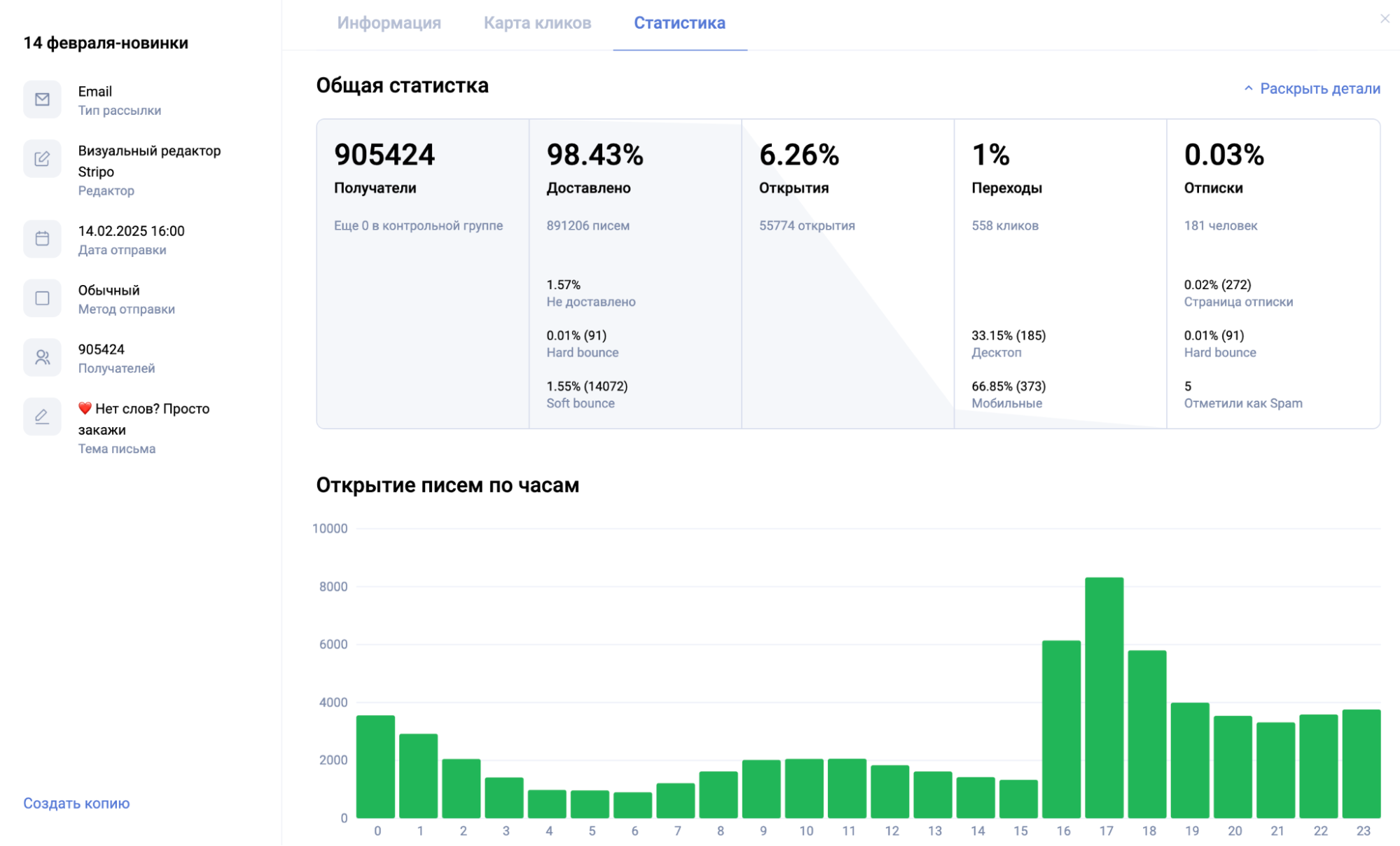 В разделе статистики можно посмотреть более детальную информацию о результатах рассылки: