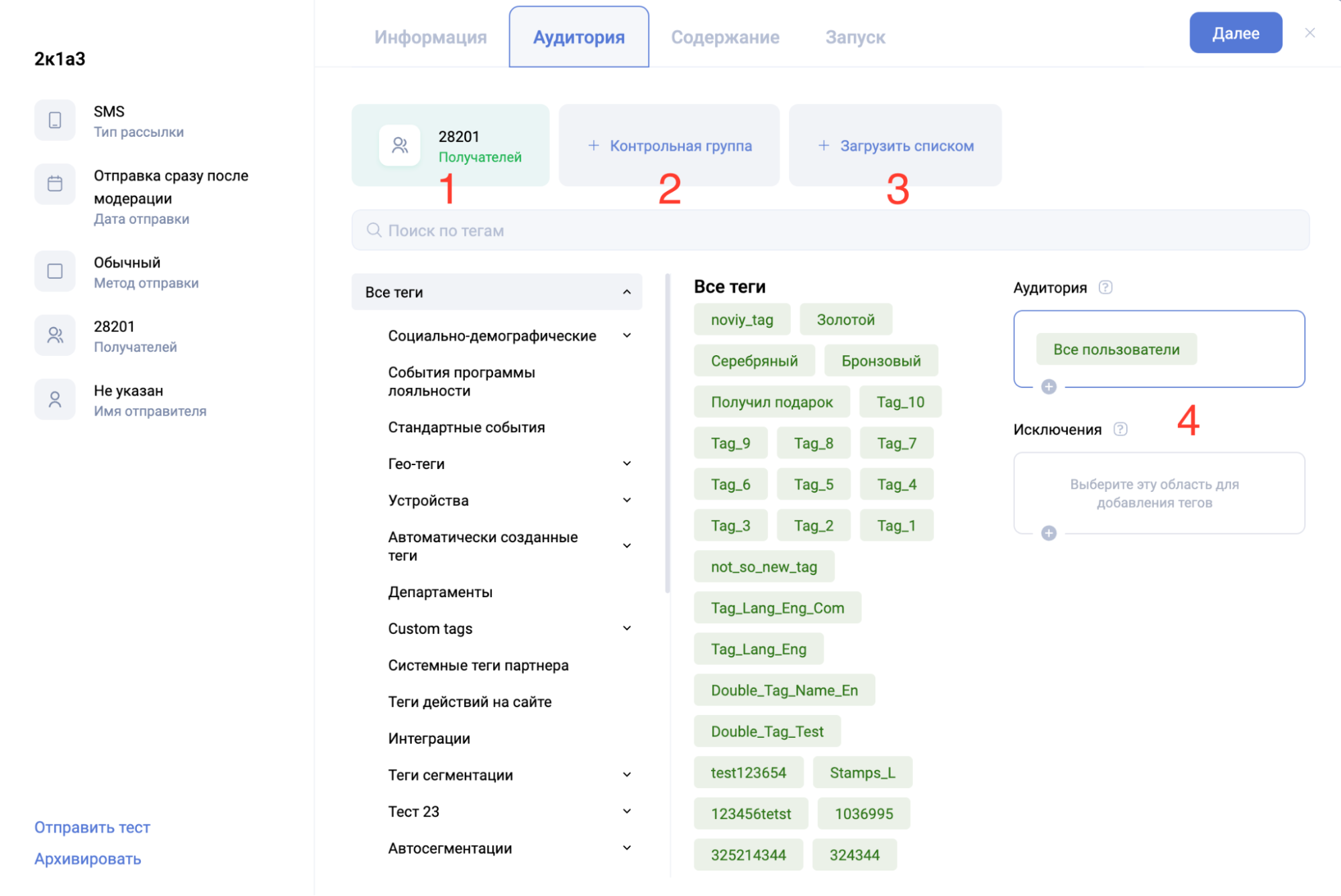 Вкладка “Аудитория” одинаковая для всех типов рассылок.