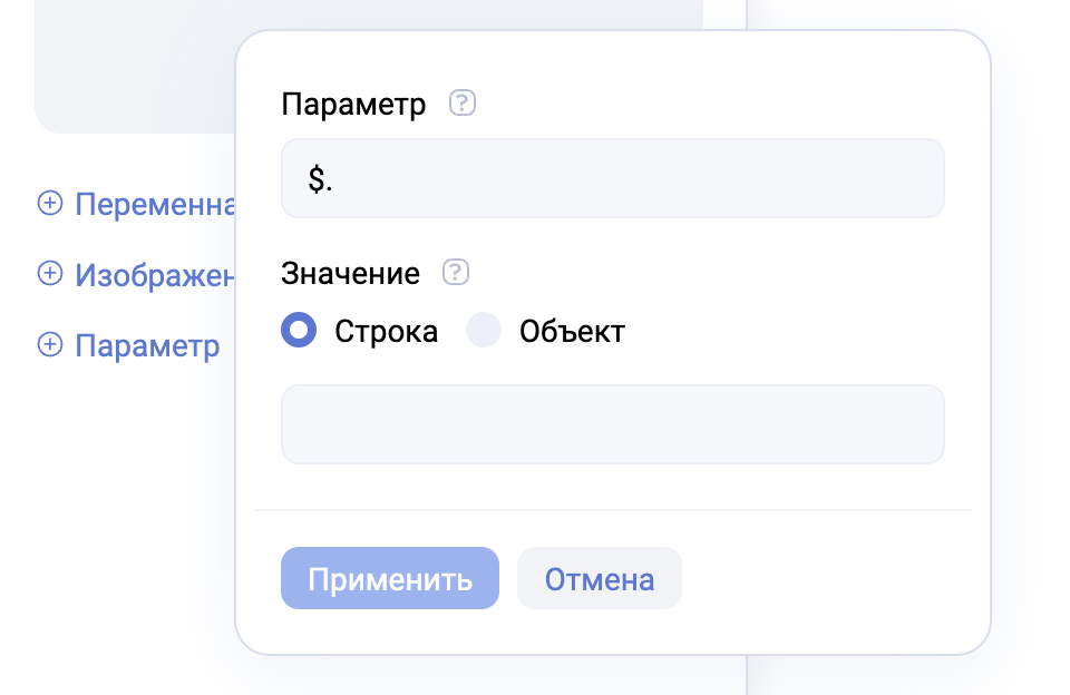 - В поле “значение” можно передать “Строку” типа String или “Объект”, который позволяет передать значение без преобразования в тип String.