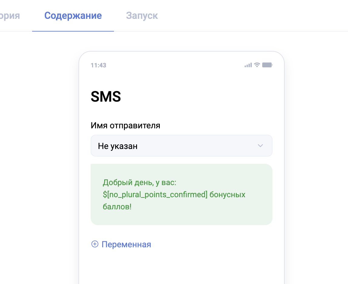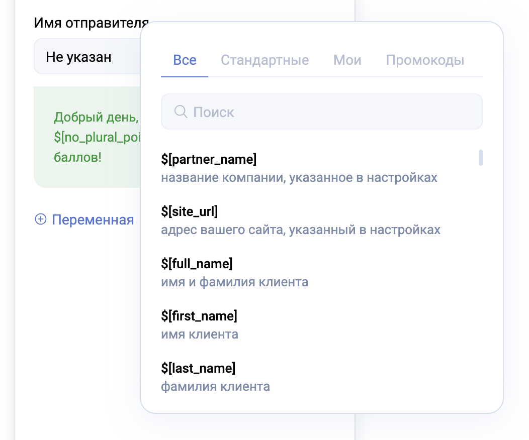В текст сообщения можно вставить переменные. Открыть все доступные переменные можно нажатием на слово “переменная” (здесь можно вставить ссылку на пункт про переменные в доке про клиентов). Если нажать на переменную из списка, то она сразу появится в тексте сообщения в месте, где стоит курсор.