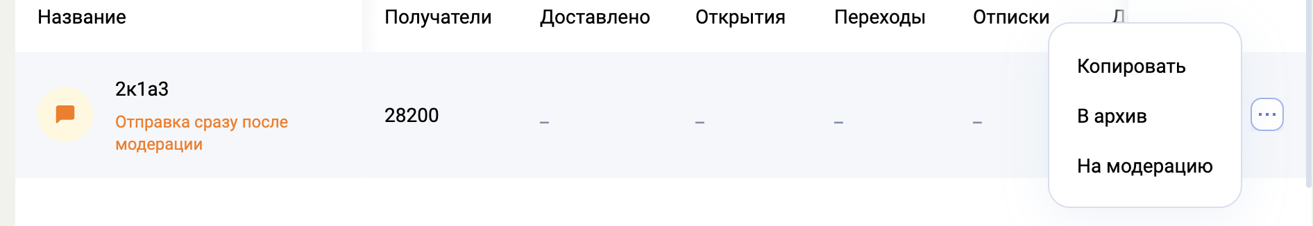 - Черновики — рассылка в том состоянии, когда ее можно редактировать: поменять аудиторию, содержание, дату/время отправки, отправить на модерацию или в архив. В списке рассылок под названием рассылки написано “Планируется + дата/время” или “Отправка сразу после модерации”