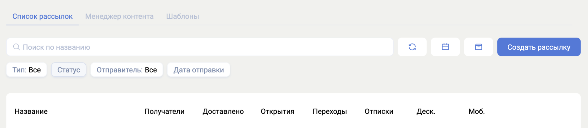 Календарь — переключение на режим отображения в формате календаря, в котором можно посмотреть когда какие рассылки были запланированы и отправлены