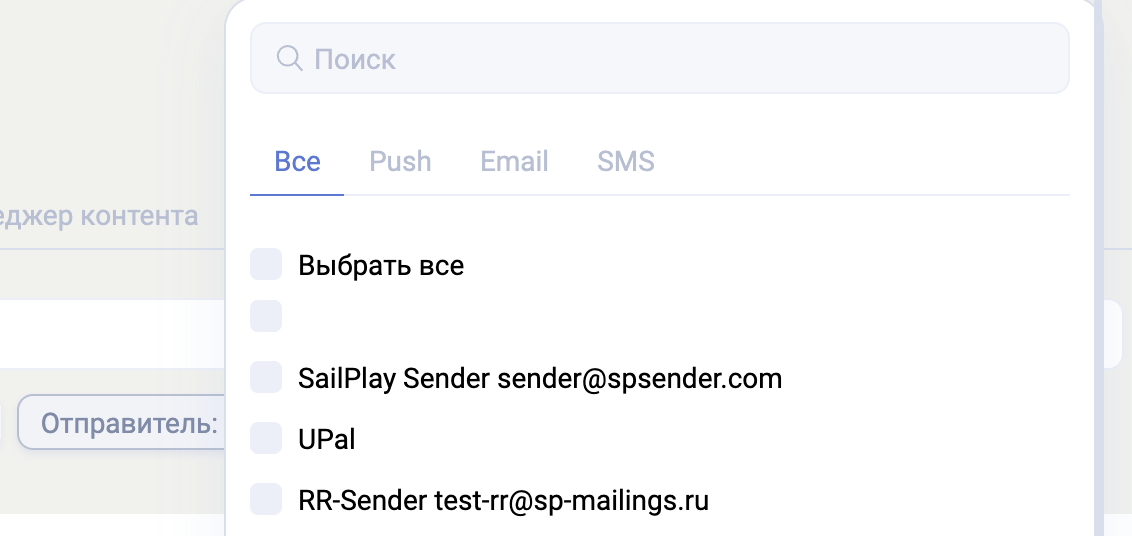 Отправитель — фильтр по имени отправителя. У одного партнера может быть несколько имен отправителя: они разнятся как по типу рассылки, так и в одном типе может быть несколько имен.