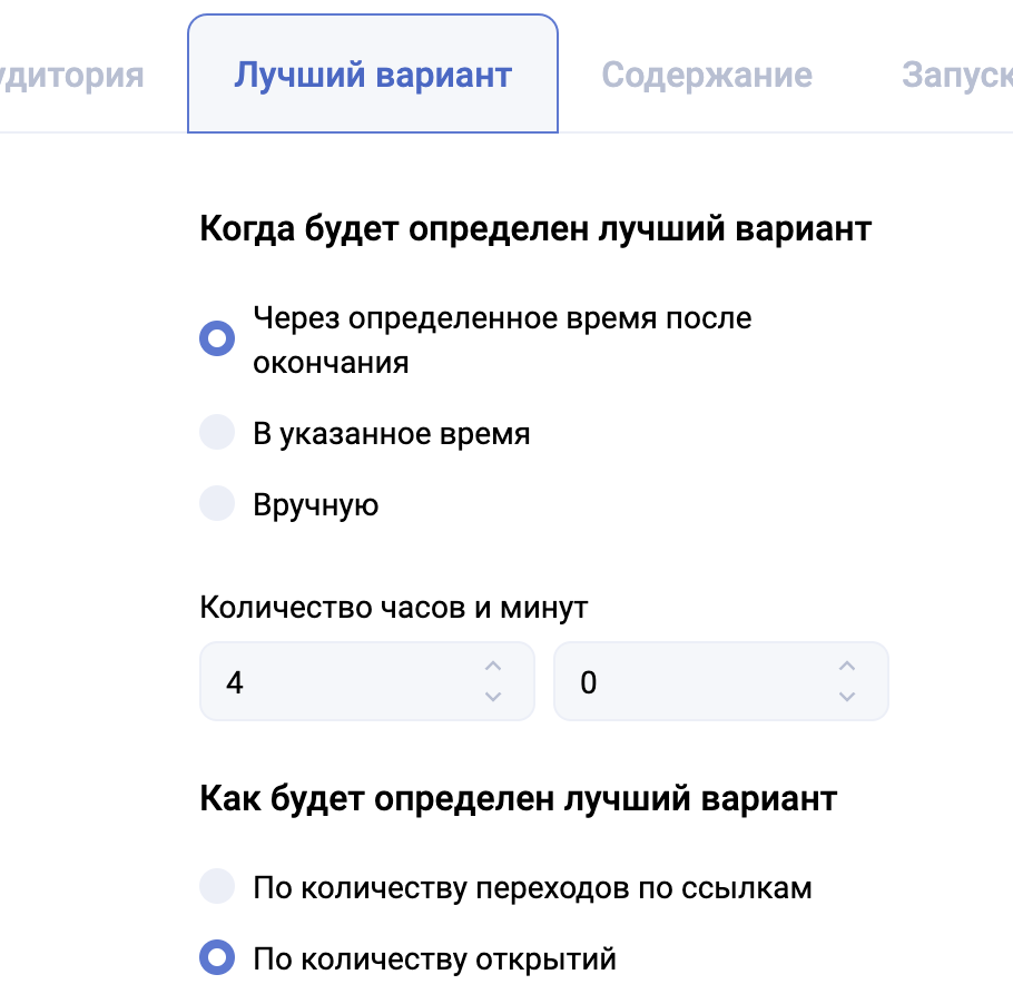 - Когда будет определен лучший вариант – время выбора победившего шаблона, который будет отправлен основной аудитории. Можно указать время относительно завершения рассылки, точное время или вариант “Вручную” – тогда автоматический запуск рассылки на основную аудиторию не произойдет.
