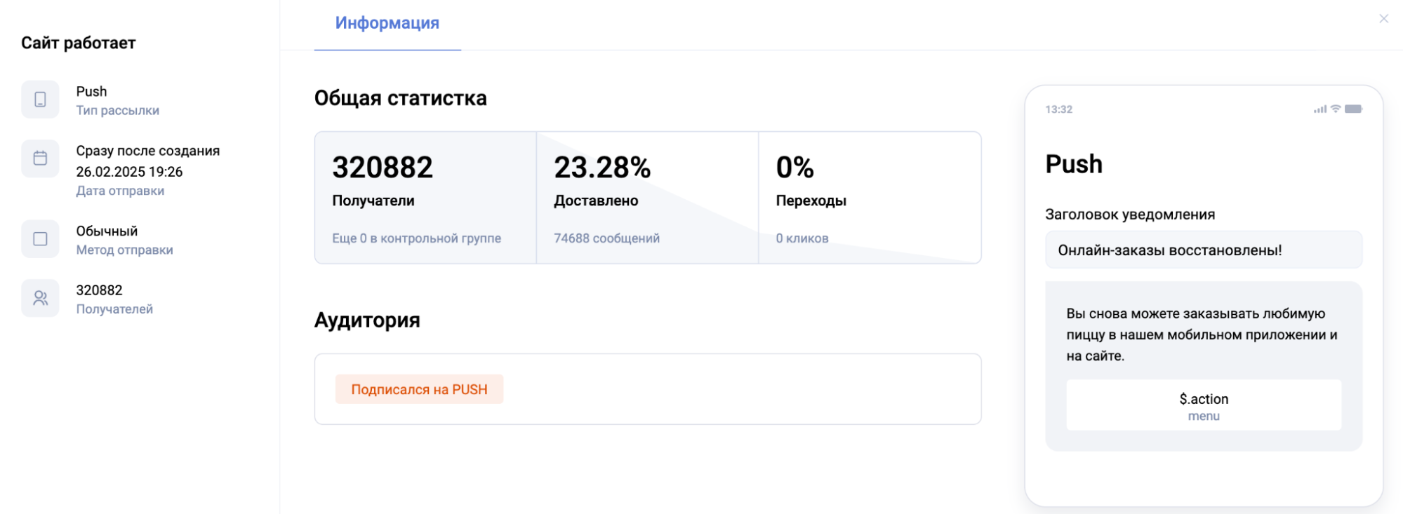 В SMS и Push рассылках есть только этот раздел, и в нем помимо основной информации есть общая статистка по результатам рассылки.
