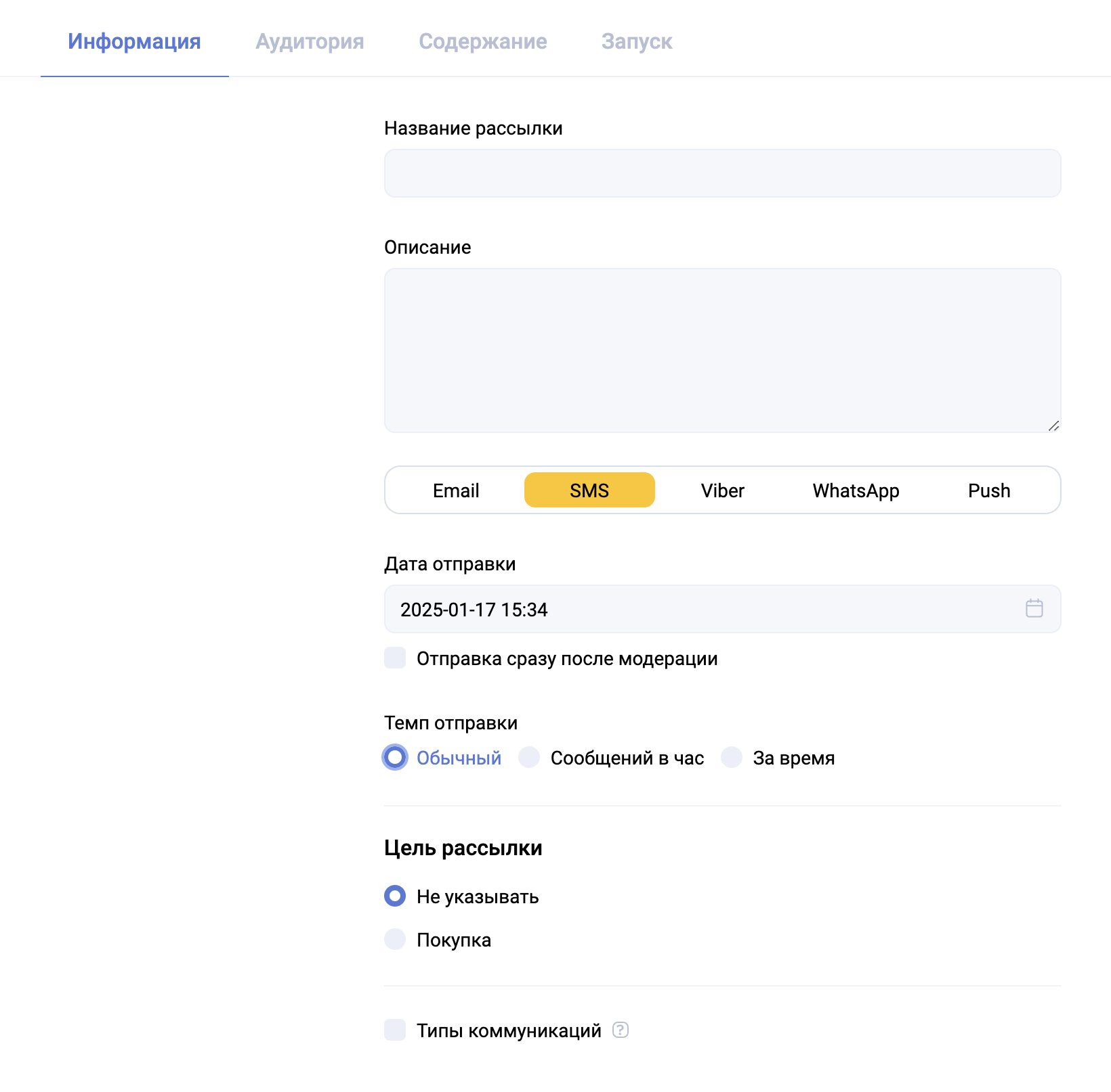 Типы коммуникаций – это способ дополнительно сегментировать рассылку и клиентов, ее получивших, по типу и каналу коммуникации. Например, если выбрать тип коммуникации “email”, то получателям такой рассылки будет присвоен тег вида “Получил тип сообщения…”