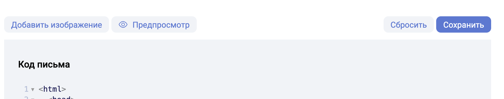 - HTML. В данном примере используется редактор Stripo, в котором можно использовать уже настроенные блоки, но, если требуется сделать более кастомный шаблон, то можно перейти в HTML-редактор Stripo и редактировать рассылку уже там.