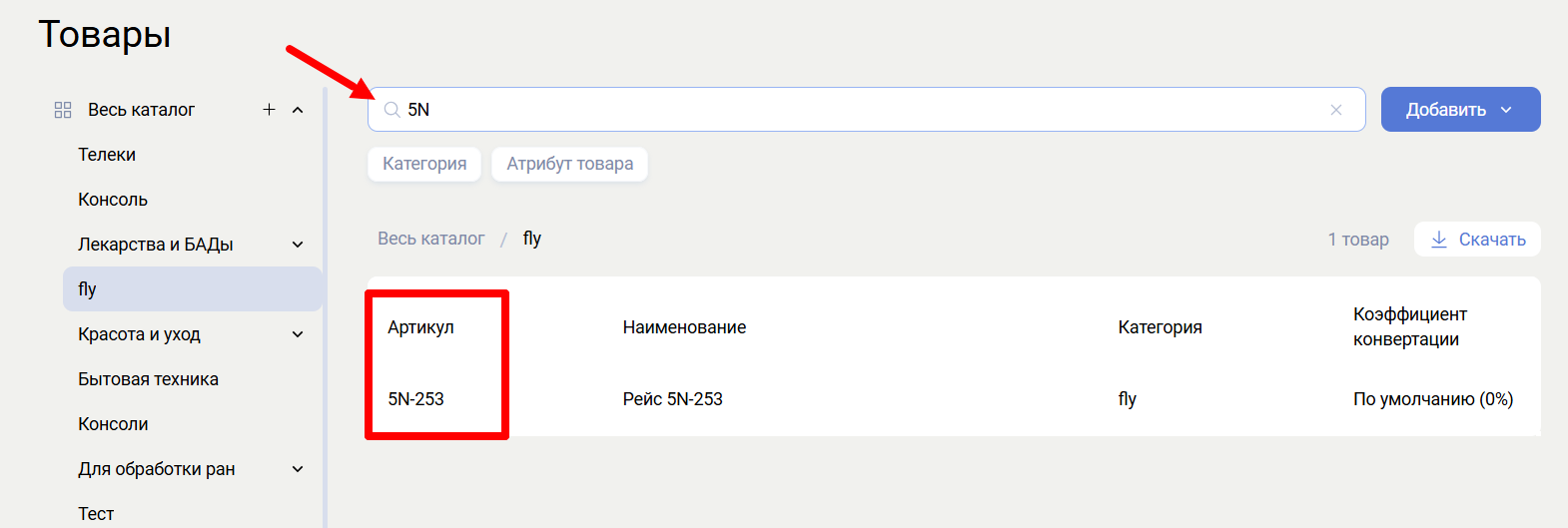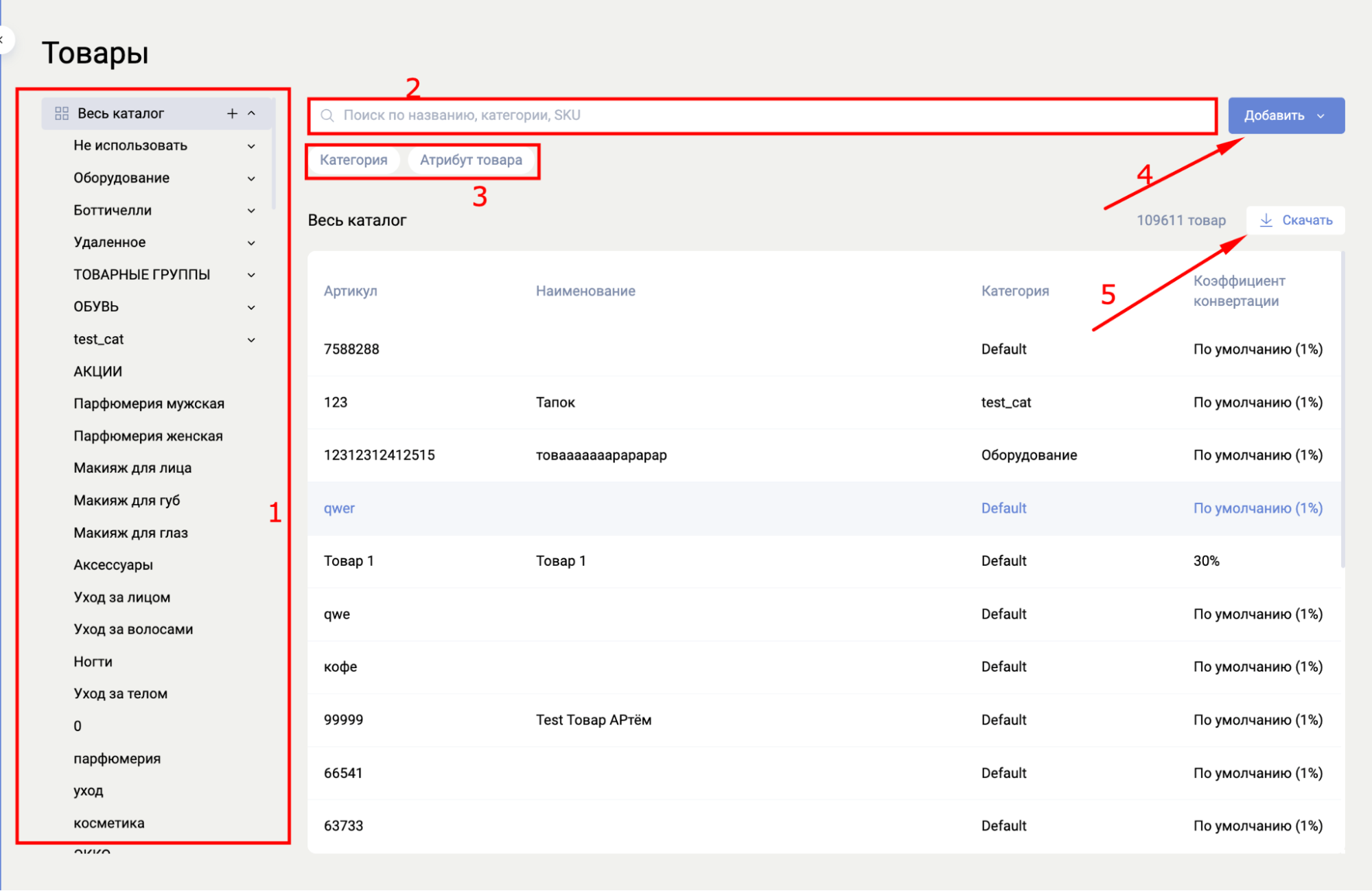 - Скачивание товаров — кнопка скачивания всех товаров в виде файла.