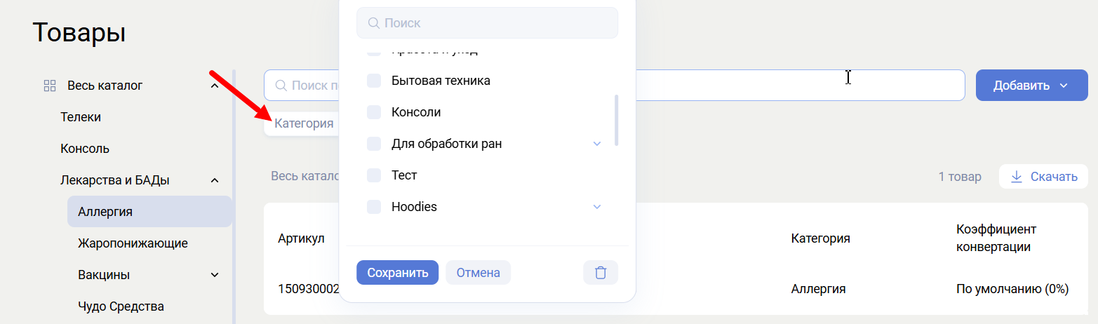 - По товарным категориям (через выпадающий список).