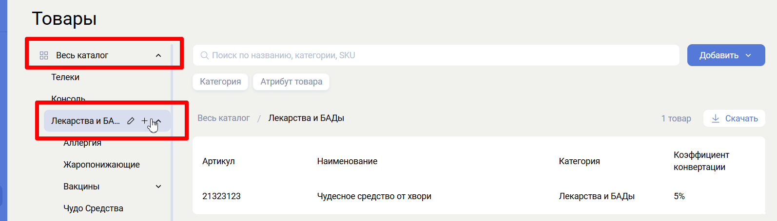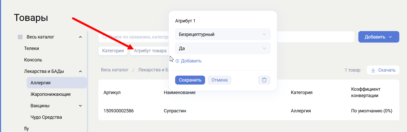 Раздел Товары позволяет создавать и редактировать товары, товарные категории и атрибуты товаров.