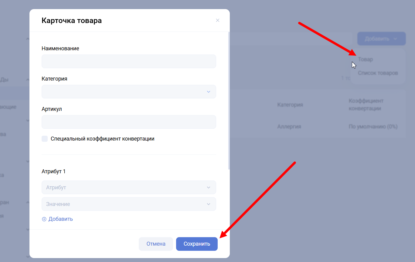 При нажатии на кнопку Добавить — Товар или на любой из товаров открывается карточка, где доступны для просмотра и редактирования: