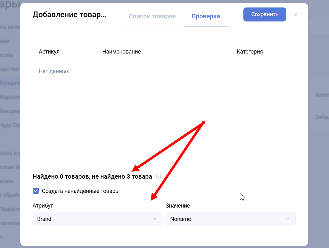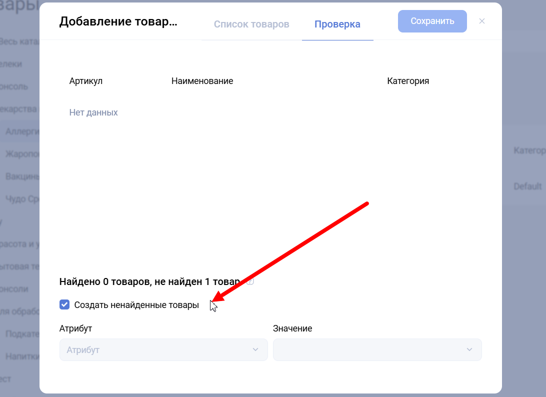 - Чекбокс "Создать не найденные товары" позволяет добавить только новые товары.