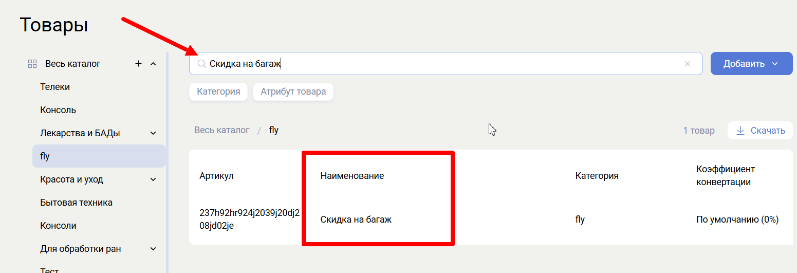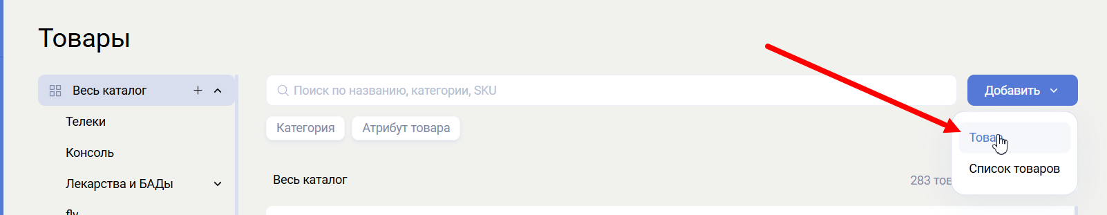 - Добавление товаров — кнопка создания нового товара.