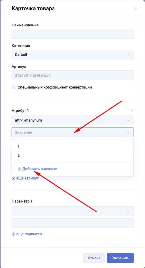 - Заполните карточку товара: выберите категорию, введите артикул и название.