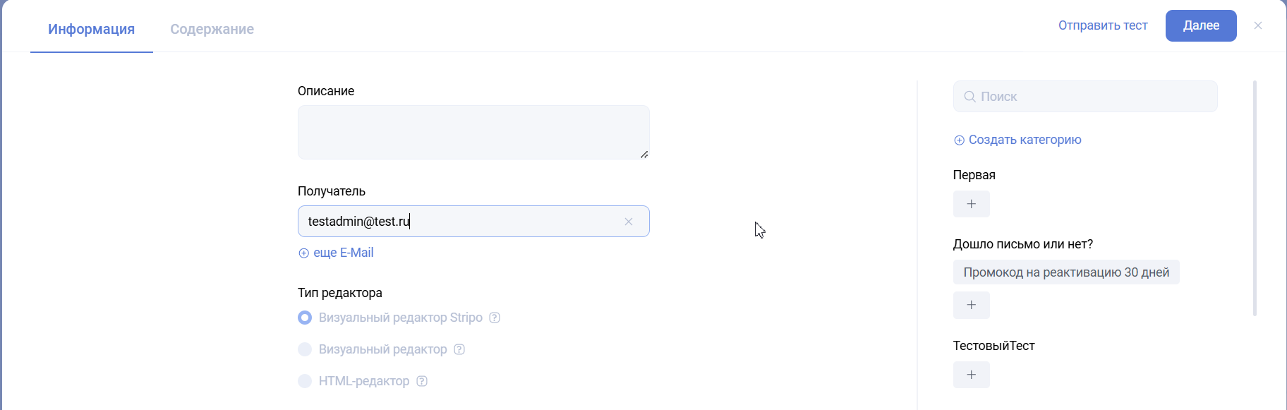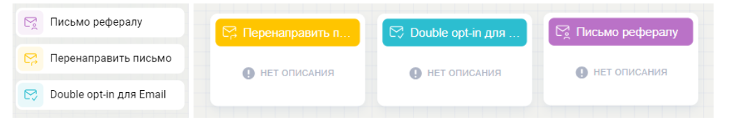 Последние три типа блоков – Email-шаблоны. Окно редактирования такое же, как у обычного письма в триггере.