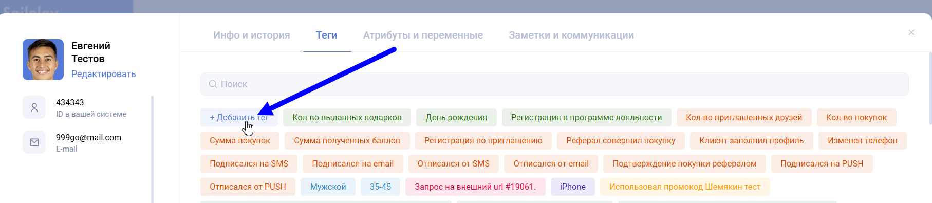 - В карточке клиента через кнопку «+ Добавить тег».