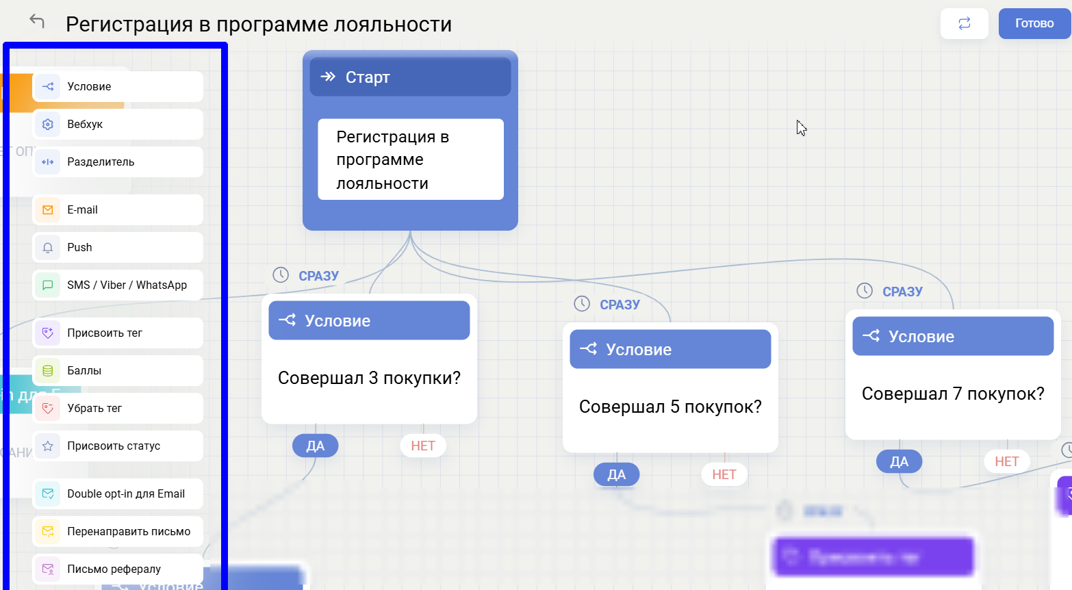 Блок «Условие» позволяет проверить, соответствует ли клиент заданным критериям, и на основании результата выбрать дальнейший сценарий.