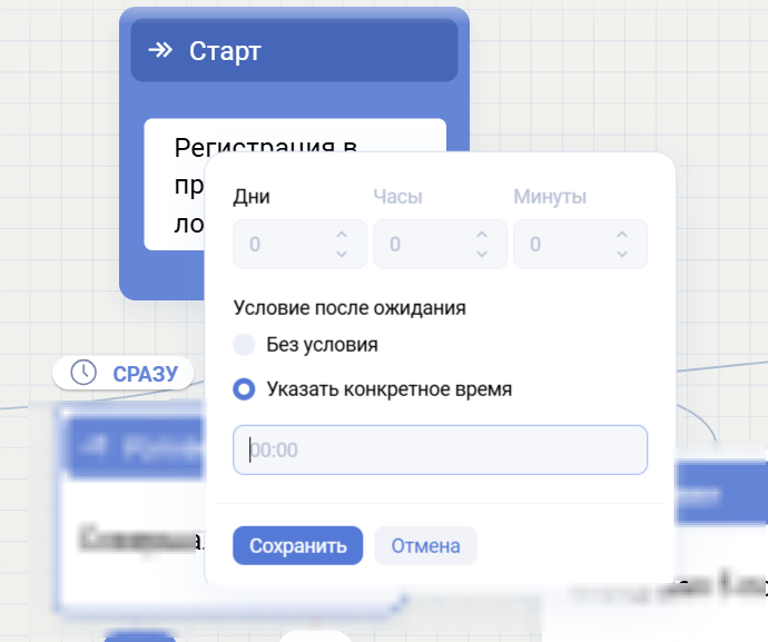 По умолчанию следующий блок запускается сразу после выполнения предыдущего. Возможна настройка задержки: нажмите на кнопку «Сразу» над нужным блоком и выберите требуемое время задержки.