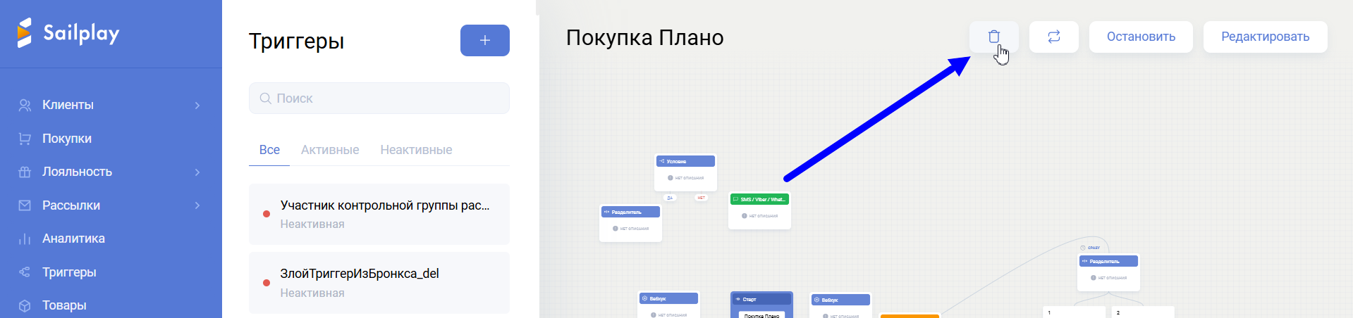 – Удалить можно только цепочку триггера через кнопку с изображением корзины.