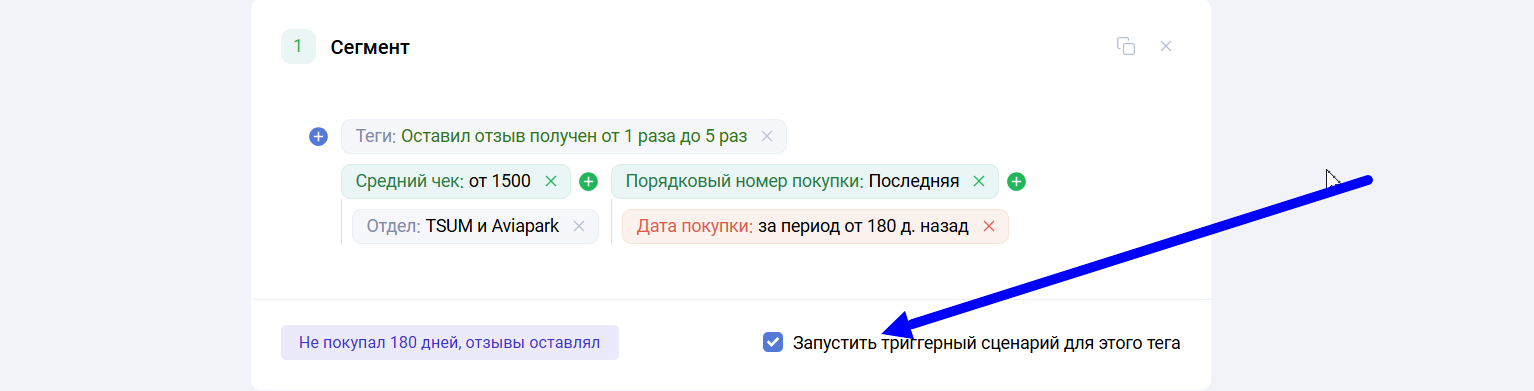 – Триггерные сценарии называются так же, как и теги, на основе которых они запускаются. Единственным исключением является тег “Кол-во покупок”, который в триггерах называется “Подтверждение покупки”.