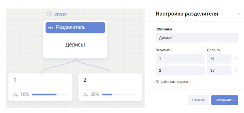 Блок «Разделитель» позволяет без проверки условия разделить триггер в заданной пропорции. Максимум 4 варианта. Например, если установить для первого сегмента долю 70%, а для второго – 30%, то примерно для 7 из 10 клиентов сработает первый вариант и примерно для 3 из 10 – второй.