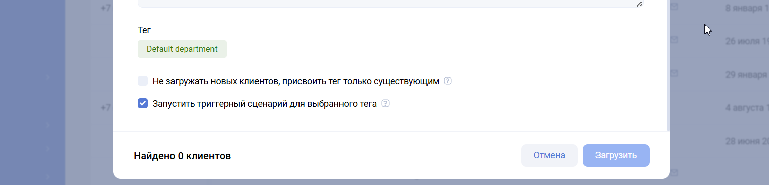 - При загрузке клиентов: Если при загрузке (списком или файлом) активирован флажок «Запустить триггерный сценарий для этого тега».