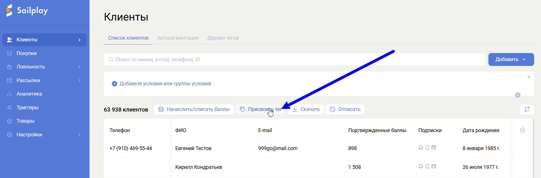 При массовом присвоении тега в разделе «Клиенты».