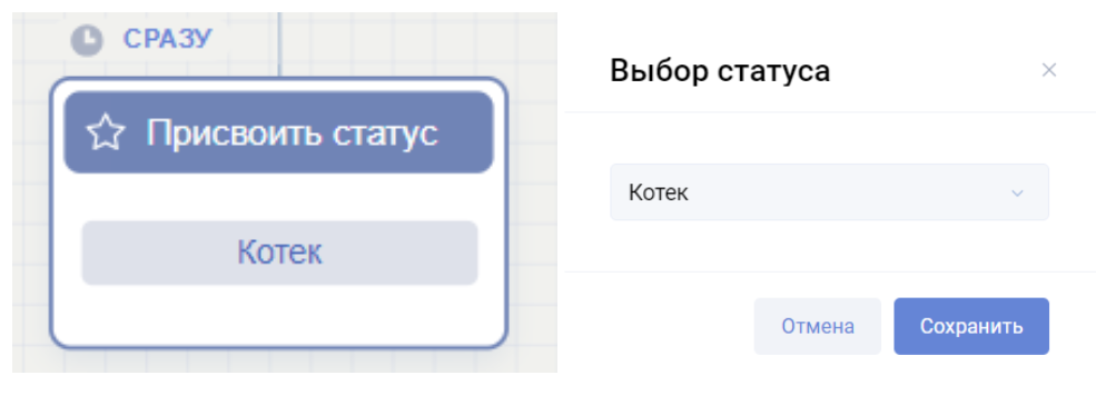 Блок «Присвоить статус» позволяет назначить клиенту определённый статус. Это устаревшая функция и мы не рекомендуем ее использовать в своих бизнес-процессах, а использовать теги.