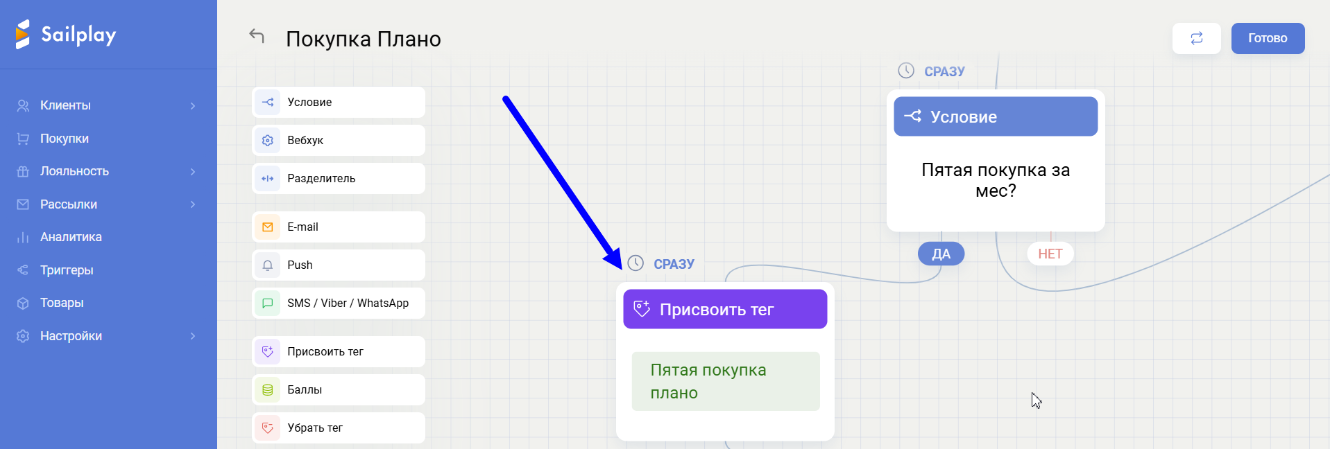 При присвоении системных тегов (например «Покупка») триггеры срабатывают автоматически. Для всех остальных тегов, запуск триггерной цепочки производится отдельным действием.