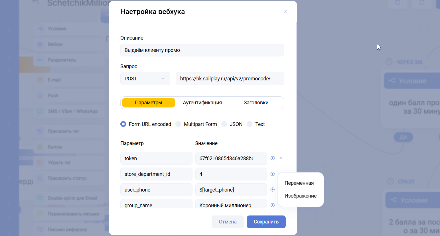 – В Form URL encoded и Multipart Form можно выбирать доступные переменные из списка и изображения из менеджера контента. Ниже пример вебхука с запросом к API Sailplay на выдачу промокода.