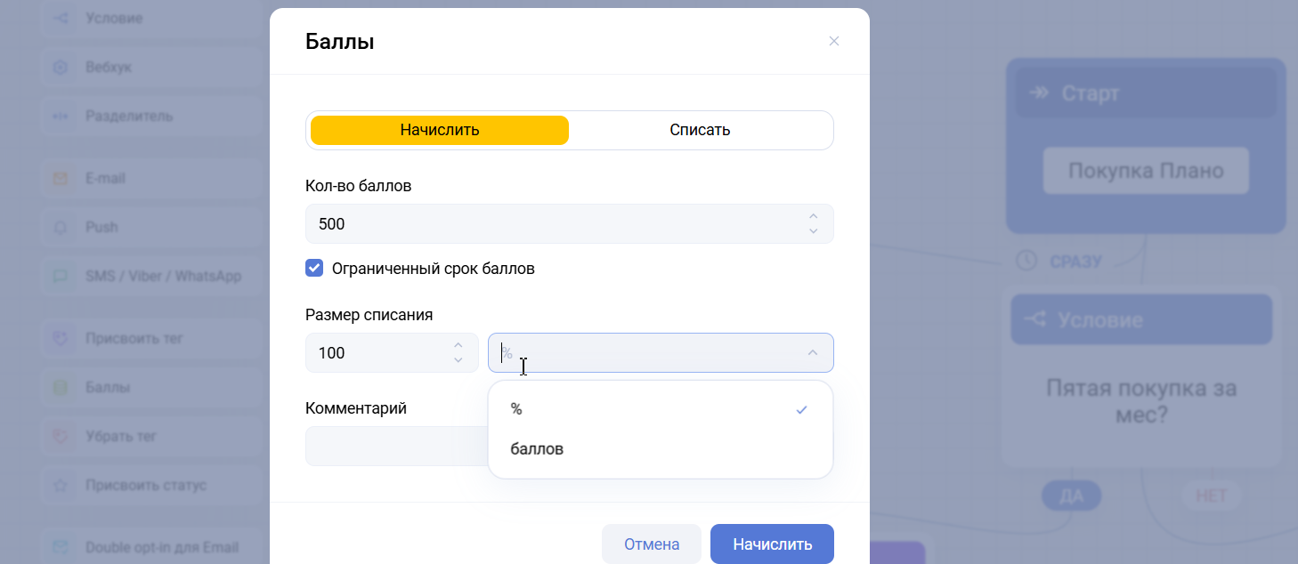 – Можно указать, сколько баллов сгорит – в процентах или в абсолютном значении.