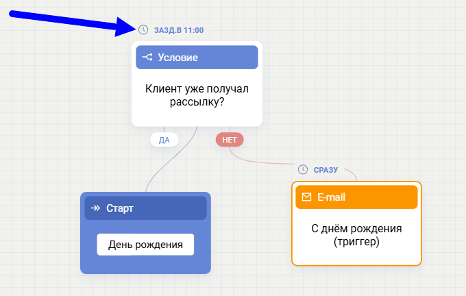 В блоках триггера день рождения по умолчанию ставится время 11:00 в день рождения. Из-за общего правила нельзя поставить другое время в рамках дня рождения (“конкретное время” на “сегодня” задавать нельзя). При смене времени добавится 1 день.